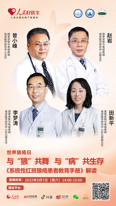 5月7日14:00至15:00,國家皮膚與免疫疾病臨床醫(yī)學研究中心主任曾小峰,國家皮膚與免疫疾病臨床醫(yī)學研究中心副主任趙巖,國家皮膚與免疫疾病臨床醫(yī)學研究中心辦公室主任李夢濤,國家皮膚與免疫疾病臨床醫(yī)學研究中心辦公室副主任田新平,將做客“人民好醫(yī)生”健康科普直播間,為大家解讀關于系統(tǒng)性紅斑狼瘡的相關內容,歡迎大家收看。