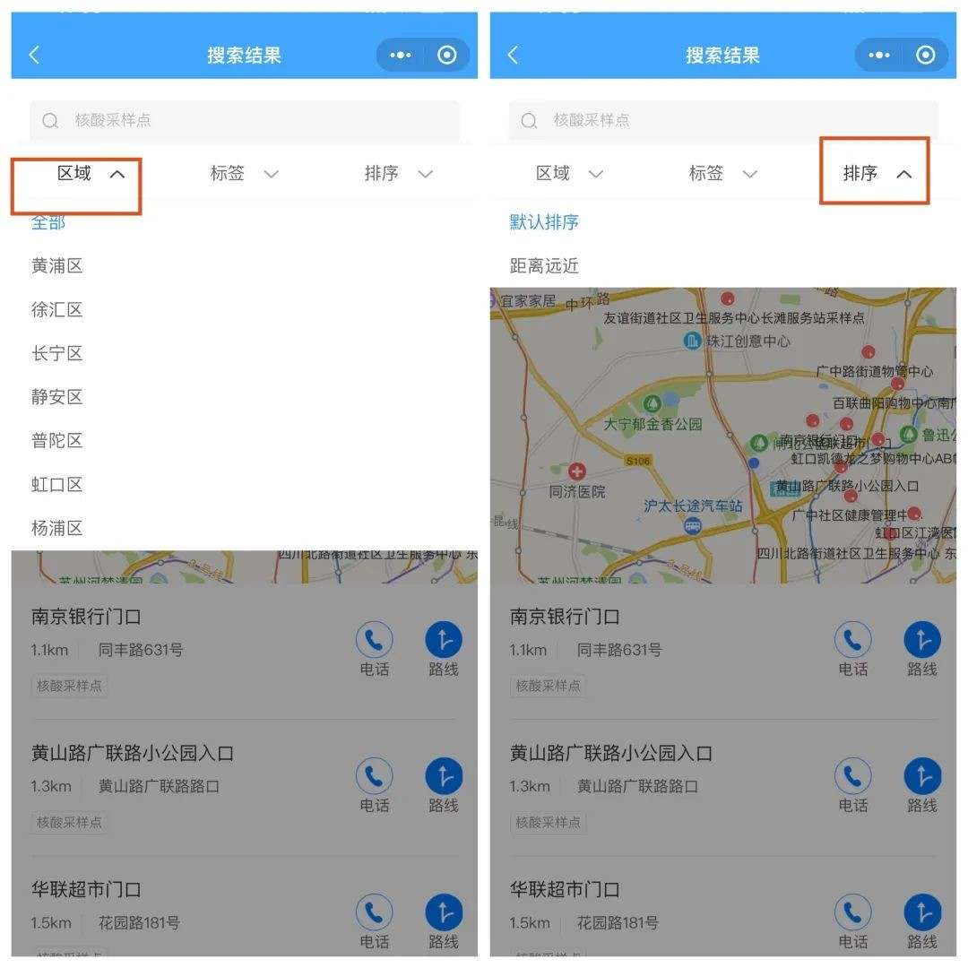 3、系統(tǒng)提供兩種查詢方式。方式一,可通過點擊【區(qū)域】選擇自己所在行政區(qū)篩選采樣點;方法二,可通過點擊【排序】選擇【距離遠近】找到自己就近采樣點。通過點擊可查看某個采樣點的詳細地址、服務(wù)時段、電話等信息。