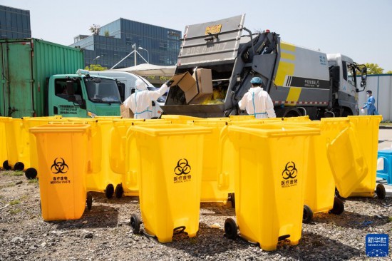 5月4日,在上海浦東北蔡鎮(zhèn)設(shè)立的醫(yī)護(hù)集散點(diǎn),工作人員在處理醫(yī)療廢物。