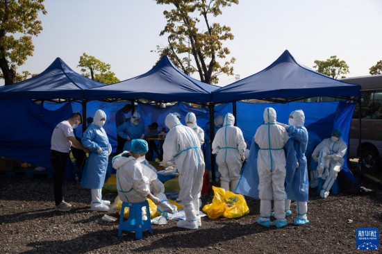 5月4日,在上海浦東北蔡鎮(zhèn)設(shè)立的醫(yī)護集散點,參加核酸采樣的醫(yī)護人員準備出發(fā)去采樣。