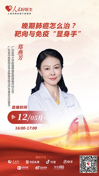 5月12日16:00 ,“人民好醫(yī)生”客戶端將邀請(qǐng)廣州醫(yī)科大學(xué)附屬腫瘤醫(yī)院腫瘤內(nèi)科主任、廣東省中西醫(yī)結(jié)合學(xué)會(huì)腫瘤生物治療專委會(huì)主任委員鄭燕芳做客直播間,就“晚期肺癌治療”話題與公眾進(jìn)行分享,歡迎屆時(shí)收看。