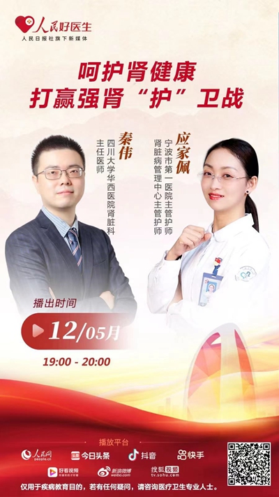 為提高公眾對(duì)腎臟病的認(rèn)知,強(qiáng)調(diào)慢性腎臟。–KD)長(zhǎng)期規(guī)范管理的重要性,以及科普醫(yī)生、護(hù)士、患者及家屬如何配合做好CKD科學(xué)管理的相關(guān)知識(shí),5月12日19:00,“人民好醫(yī)生”客戶(hù)端將邀請(qǐng)四川大學(xué)華西醫(yī)院腎臟科主任醫(yī)師秦偉,寧波市第一醫(yī)院主管護(hù)師、腎臟病管理中心主管醫(yī)師應(yīng)家佩作客直播間,就我國(guó)慢性腎臟病相關(guān)話(huà)題進(jìn)行分享,歡迎屆時(shí)收看。