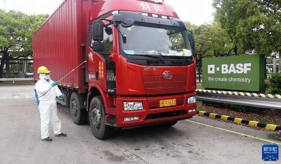 工作人員在位于上海市金山區(qū)的巴斯夫護理化學(xué)品(上海)有限公司工廠對貨車進行消殺(4月15日攝)。新華社記者 丁汀 攝