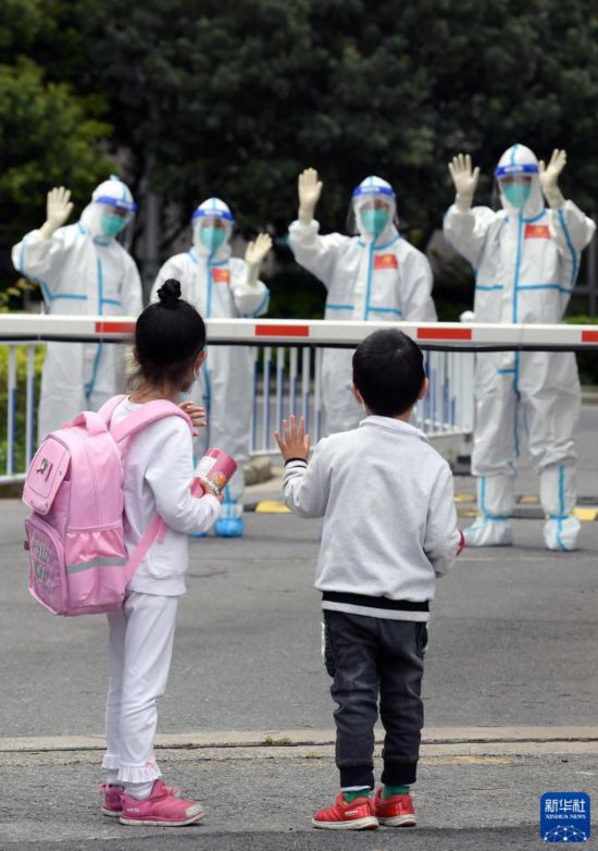 4月30日,走出醫(yī)院準(zhǔn)備回家時,小華(右)和姐姐回身向護送他們出院的醫(yī)護人員揮手道別。當(dāng)日,由上海交通大學(xué)醫(yī)學(xué)院附屬仁濟醫(yī)院南部院區(qū)(新冠定點醫(yī)院)收治的3歲重癥新冠患者小華(化名)出院。新華社記者 李賀 攝