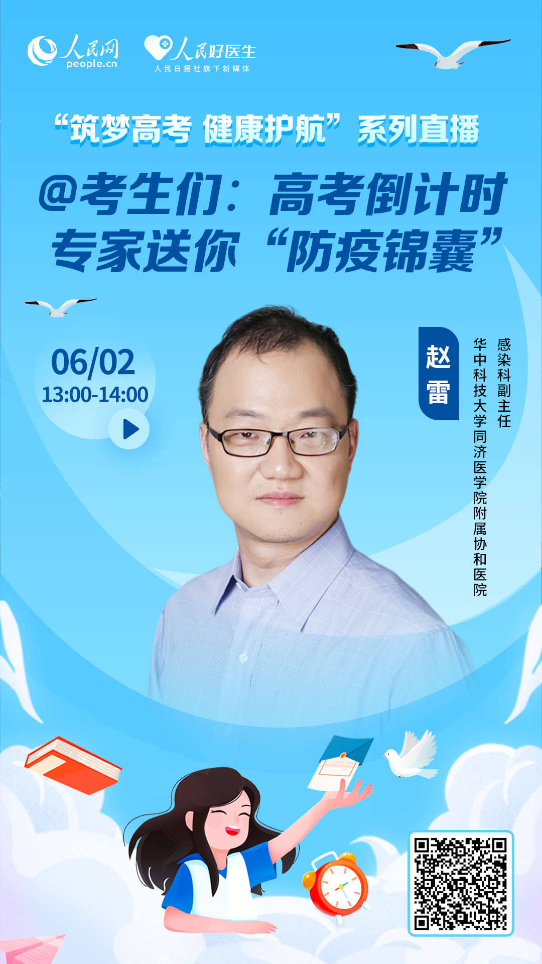 一年一度的高考現(xiàn)已進(jìn)入倒計(jì)時(shí)。關(guān)于科學(xué)防疫,考生在考前應(yīng)做好哪些準(zhǔn)備?有何注意事項(xiàng)?如何做好防護(hù)保持健康狀態(tài),順利應(yīng)考?華中科技大學(xué)同濟(jì)醫(yī)學(xué)院附屬協(xié)和醫(yī)院感染科副主任趙雷做客直播間,和大家分享關(guān)于高考期間健康防疫那些事。