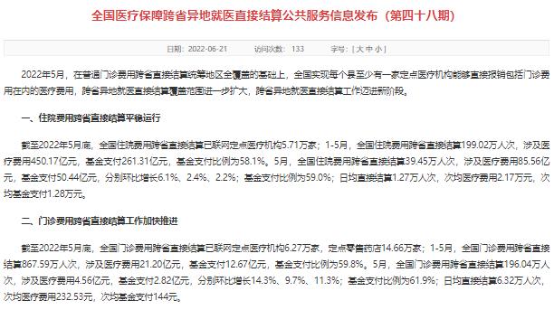 聚焦1.25億跨省流動(dòng)人口的就醫(yī)結(jié)算需求,深入推進(jìn)醫(yī)保領(lǐng)域“放管服”改革,2021年以來,國家醫(yī)保局會(huì)同有關(guān)部門鞏固拓展住院費(fèi)用跨省直接結(jié)算成果,全面推動(dòng)門診費(fèi)用跨省直接結(jié)算工作。截至2022年5月底,全國住院費(fèi)用跨省直接結(jié)算已聯(lián)網(wǎng)定點(diǎn)醫(yī)療機(jī)構(gòu)5.71萬家;1-5月,全國住院費(fèi)用跨省直接結(jié)算199.02萬人次,涉及醫(yī)療費(fèi)用450.17億元,基金支付261.31億元,基金支付比例為58.1%。截至2022年5月底,全國門診費(fèi)用跨省直接結(jié)算已聯(lián)網(wǎng)定點(diǎn)醫(yī)療機(jī)構(gòu)6.27萬家,定點(diǎn)零售藥店14.66萬家;1-5月,全國門診費(fèi)用跨省直接結(jié)算867.59萬人次,涉及醫(yī)療費(fèi)用21.20億元,基金支付12.67億元,基金支付比例為59.8%。