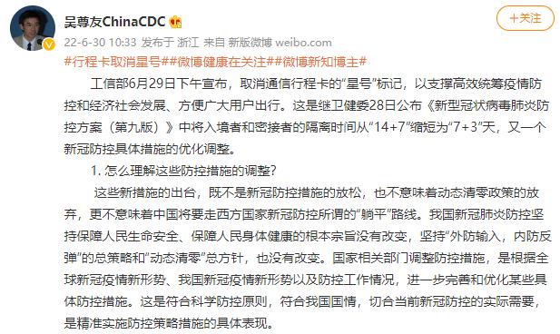 人民網(wǎng)北京6月30日電 (記者喬業(yè)瓊)工信部6月29日下午宣布,取消通信行程卡的“星號”標(biāo)記,以支撐高效統(tǒng)籌疫情防控和經(jīng)濟(jì)社會發(fā)展、方便廣大用戶出行。這是繼衛(wèi)健委28日公布《新型冠狀病毒肺炎防控方案(第九版)》中將入境者和密接者的隔離時間從“14+7”縮短為“7+3”天,又一個新冠防控具體措施的優(yōu)化調(diào)整。對此,中國疾控中心流行病學(xué)首席專家吳尊友今日上午在其微博上表示,這符合科學(xué)防控原則,符合我國國情,切合當(dāng)前新冠防控的實際需要,是精準(zhǔn)實施防控策略措施的具體表現(xiàn)。