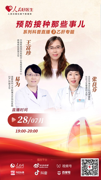 7月28日19:00至20:00,“人民好醫(yī)生”將邀請中國疾病預防控制中心免疫規(guī)劃中心病毒病疫苗室主任王富珍、首都醫(yī)科大學附屬北京地壇醫(yī)院婦產(chǎn)科副主任易為、北京市海淀區(qū)婦幼保健院社區(qū)衛(wèi)生管理科主任張良芬做客直播間,為大家科普乙肝防控及疫苗接種相關知識,千萬不要錯過。