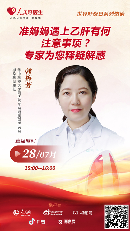 7月28日15:00,華中科技大學(xué)同濟(jì)醫(yī)學(xué)院附屬同濟(jì)醫(yī)院感染科副主任韓梅芳將做客“人民好醫(yī)生”客戶端直播間,向廣大網(wǎng)友分享乙肝母嬰阻斷的相關(guān)知識,歡迎屆時收看。