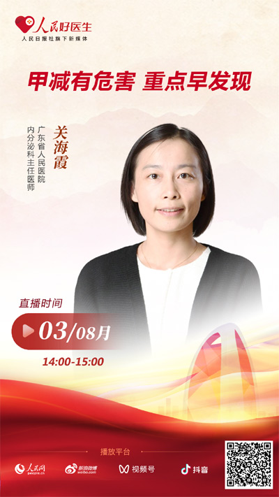 8月3日14:00,廣東省人民醫(yī)院內(nèi)分泌科主任醫(yī)師關(guān)海霞將做客“人民好醫(yī)生”健康科普直播間,與大家就甲狀腺功能減退相關(guān)知識進(jìn)行講解。