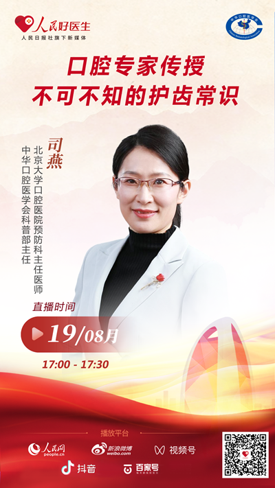 8月19日17:00,北京大學(xué)口腔醫(yī)院預(yù)防科主任醫(yī)師、中華口腔醫(yī)學(xué)會科普部部長司燕做客“人民好醫(yī)生”客戶端,為大家分享保持牙齒健康的實用技巧。歡迎屆時收看。