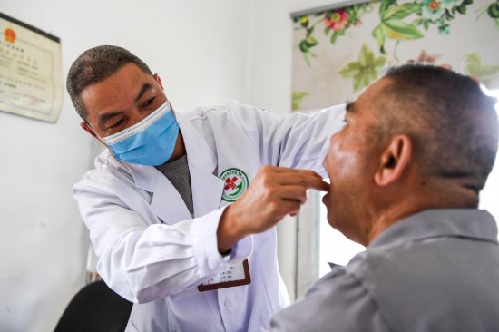 2021年11月3日,在廣西崇左大新縣下雷鎮(zhèn)仁愛村,鄉(xiāng)村醫(yī)生趙建柏為村民檢查口腔。新華社記者 曹祎銘 攝