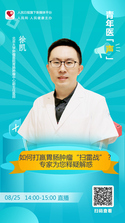 8月25日14:00,北京大學(xué)腫瘤醫(yī)院胃腸腫瘤中心副主任醫(yī)師徐凱將做客人民日報(bào)社旗下新媒體平臺“人民好醫(yī)生”客戶端《青年醫(yī)“聲”》直播間,和大家分享胃腸腫瘤的相關(guān)知識,歡迎屆時(shí)收看。