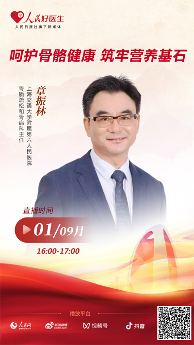 9月1日16:00,上海交通大學(xué)附屬第六人民醫(yī)院骨質(zhì)疏松和骨病科主任章振林將做客“人民好醫(yī)生”直播間,就骨質(zhì)疏松等相關(guān)內(nèi)容和網(wǎng)友進(jìn)行分享。