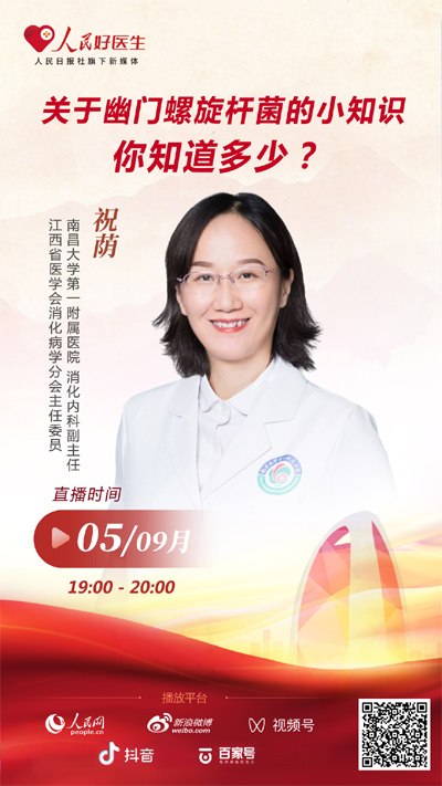 9月5日19:00,南昌大學(xué)第一附屬醫(yī)院消化內(nèi)科副主任、江西省醫(yī)學(xué)會消化病學(xué)分會主任委員祝蔭將做客“人民好醫(yī)生”客戶端,和大家聊一聊幽門螺旋桿菌的相關(guān)知識。