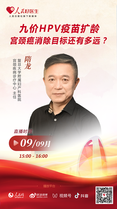 9月9日15:00至16:00,復旦大學附屬婦產(chǎn)科醫(yī)院宮頸疾病診療中心主任隋龍將做客“人民好醫(yī)生”客戶端直播間,就宮頸癌和九價HPV疫苗的相關知識與網(wǎng)友進行分享,歡迎屆時收看。