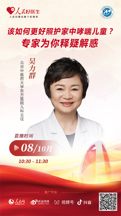 家有哮喘患兒的父母該如何更好地做好家庭照護(hù)?10月8日10:30,北京中醫(yī)藥大學(xué)東方醫(yī)院兒科主任、兒科教研室主任吳力群將做客“人民好醫(yī)生”客戶端直播間,向廣大網(wǎng)友分享兒童哮喘相關(guān)知識(shí)。