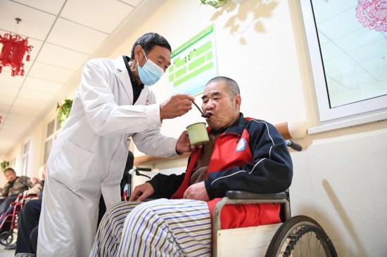 2021年12月28日,河北省景縣人民醫(yī)院醫(yī)養(yǎng)中心工作人員幫助老人喝水。新華社記者 朱旭東 攝