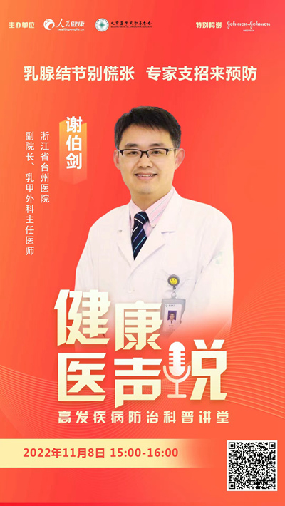 11月8日15:00,“人民好醫(yī)生”客戶端將邀請(qǐng)浙江省臺(tái)州醫(yī)院黨委委員、副院長、乳腺甲狀腺外科副主任謝伯劍,給大家科普乳腺結(jié)節(jié)的相關(guān)知識(shí)。