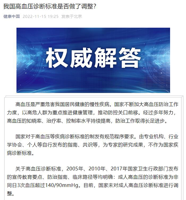 國(guó)家衛(wèi)健委:目前國(guó)家未對(duì)成人高血壓診斷標(biāo)準(zhǔn)進(jìn)行調(diào)整