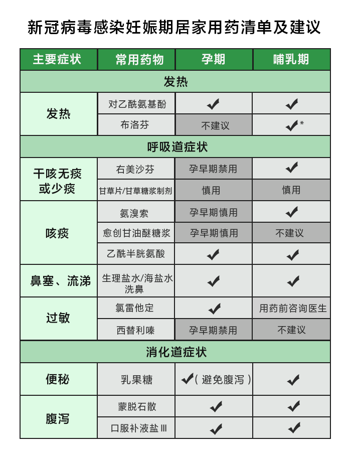 針對(duì)大家普遍關(guān)心的孕媽媽感染新冠病毒后具體可用的藥物有哪些?文章指出,妊娠早期是胚胎發(fā)育的關(guān)鍵時(shí)期,在這個(gè)階段應(yīng)該盡量避免用藥以減少藥物對(duì)胚胎的影響,而妊娠中晚期相對(duì)安全,可供選擇藥物較多。國(guó)家產(chǎn)科質(zhì)控中心聯(lián)合北京市藥學(xué)質(zhì)控中心為孕媽媽整理了一份孕期可操作的常用的家庭非處方藥(OTC)用藥清單。其中部分中成藥在孕期使用的臨床經(jīng)驗(yàn)較少,安全性尚不明確,建議用藥前仔細(xì)閱讀說(shuō)明書(shū),咨詢(xún)醫(yī)生和藥師后使用。