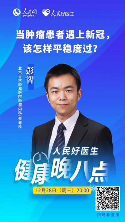 12月28日20:00,“健康晚八點”邀請北京大學腫瘤醫(yī)院營養(yǎng)科主任彭智,詳細講解腫瘤患者在疫情期間如何保護自己,怎樣平穩(wěn)度過,千萬不要錯過。