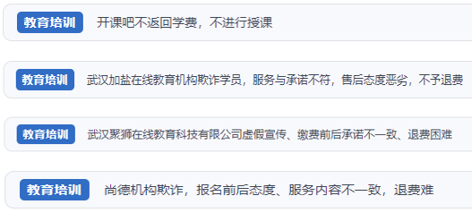 2022年以來(lái),不少教培機(jī)構(gòu)由于經(jīng)營(yíng)不善等原因出現(xiàn)無(wú)征兆閉店、無(wú)法兌現(xiàn)課程內(nèi)容和退款承諾。在“人民投訴”平臺(tái)上,用戶投訴聚焦在——“承諾的直播課變成錄播課”“虛假宣傳0元買課、學(xué)費(fèi)全額返,以免試、名額有限、考不過(guò)包退、高額掛靠等,誘導(dǎo)分期貸款”“沒(méi)有報(bào)考資格卻被忽悠交費(fèi),不給退費(fèi)”“買了幾萬(wàn)元的課程,結(jié)果現(xiàn)在沒(méi)法繼續(xù)學(xué),也不退款,強(qiáng)制換課”“不按約定返還學(xué)費(fèi),培訓(xùn)費(fèi)的貸款還不上也停不了”“一天課沒(méi)上,24小時(shí)內(nèi)提出退款申請(qǐng),拒不履行7天無(wú)理由退款”……