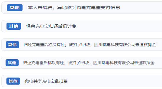 用戶投訴部分共享充電寶品牌歸還難、亂扣費(fèi)的問(wèn)題。