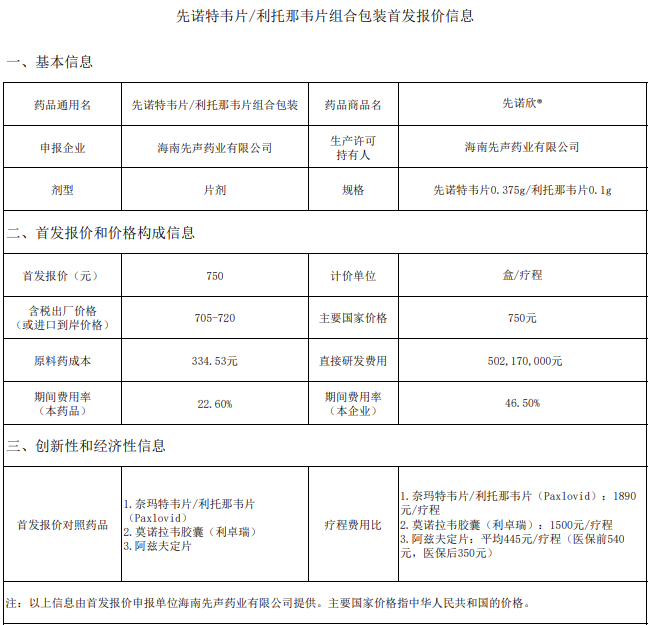 公示信息顯示,先諾特韋片/利托那韋片組合包裝的首發(fā)報價為750元/盒,含稅出廠價格(或進口到岸價格)為705-720元/盒,原料藥成本為334.53元,直接研發(fā)費用為502170000元。首發(fā)報價對照藥品包括奈瑪特韋片/利托那韋片(Paxlovid)、莫諾拉韋膠囊(利卓瑞)和阿茲夫定片。