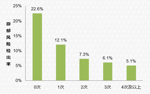 不同運(yùn)動頻率下的抑郁風(fēng)險檢出率。 資料來源:《中國國民心理健康發(fā)展報告(2021-2022)》