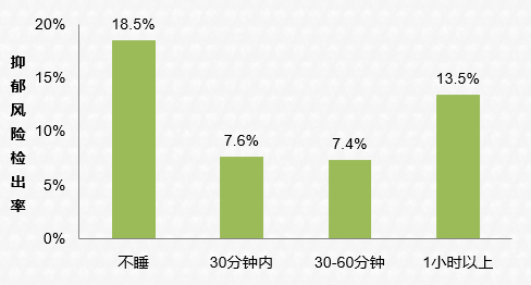 不同午睡時長下的抑郁風(fēng)險檢出率。 資料來源:《中國國民心理健康發(fā)展報告(2021-2022)》