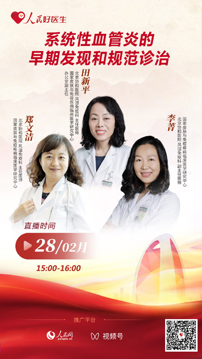 2月28日15:00,我們特別邀請到北京協(xié)和醫(yī)院風濕免疫科、國家皮膚和免疫疾病臨床醫(yī)學研究中心田新平教授、鄭文潔教授和李菁副教授做客直播間,就“系統(tǒng)性血管炎早期識別和規(guī)范診治”的相關(guān)知識進行科普。