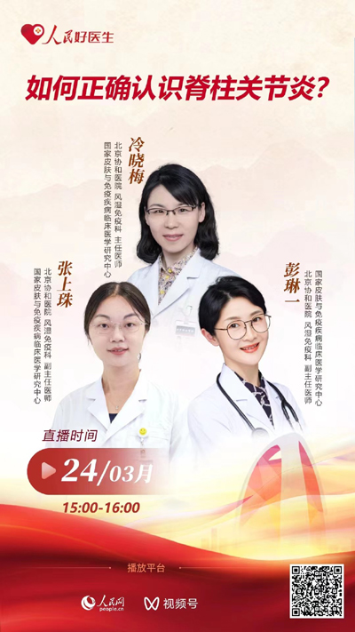 3月24日15:00,“人民好醫(yī)生”客戶端邀請(qǐng)北京協(xié)和醫(yī)院風(fēng)濕免疫科主任醫(yī)師冷曉梅、北京協(xié)和醫(yī)院風(fēng)濕免疫科副主任醫(yī)師張上珠、北京協(xié)和醫(yī)院風(fēng)濕免疫科副主任醫(yī)師彭琳一做客演播室,為公眾科普脊柱關(guān)節(jié)炎診治的相關(guān)知識(shí)。