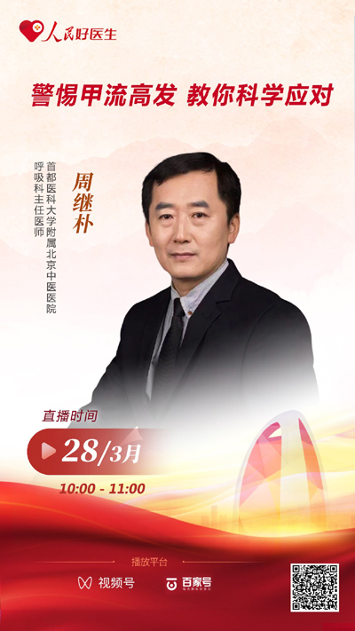 甲流感染到底嚴(yán)重嗎?會有什么樣的癥狀?該如何治療?甲流目前發(fā)展態(tài)勢究竟如何?這都是大眾所迫切希望了解的問題。3月28日10:00,首都醫(yī)科大學(xué)附屬北京中醫(yī)醫(yī)院呼吸科主任醫(yī)師周繼樸做客“人民好醫(yī)生”客戶端直播間,就如何科學(xué)應(yīng)對甲流的相關(guān)話題和網(wǎng)友進行分享。