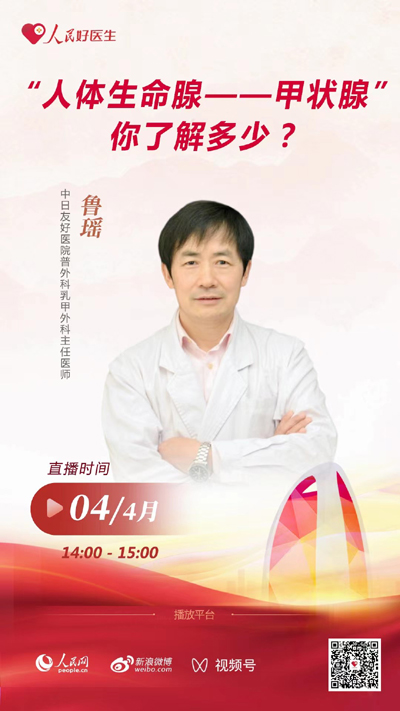 4月4日14:00,中日友好醫(yī)院普外科乳甲外科主任醫(yī)師魯瑤將做客人民日報社旗下新媒體“人民好醫(yī)生”客戶端,圍繞甲狀腺疾病相關問題進行交流分享。