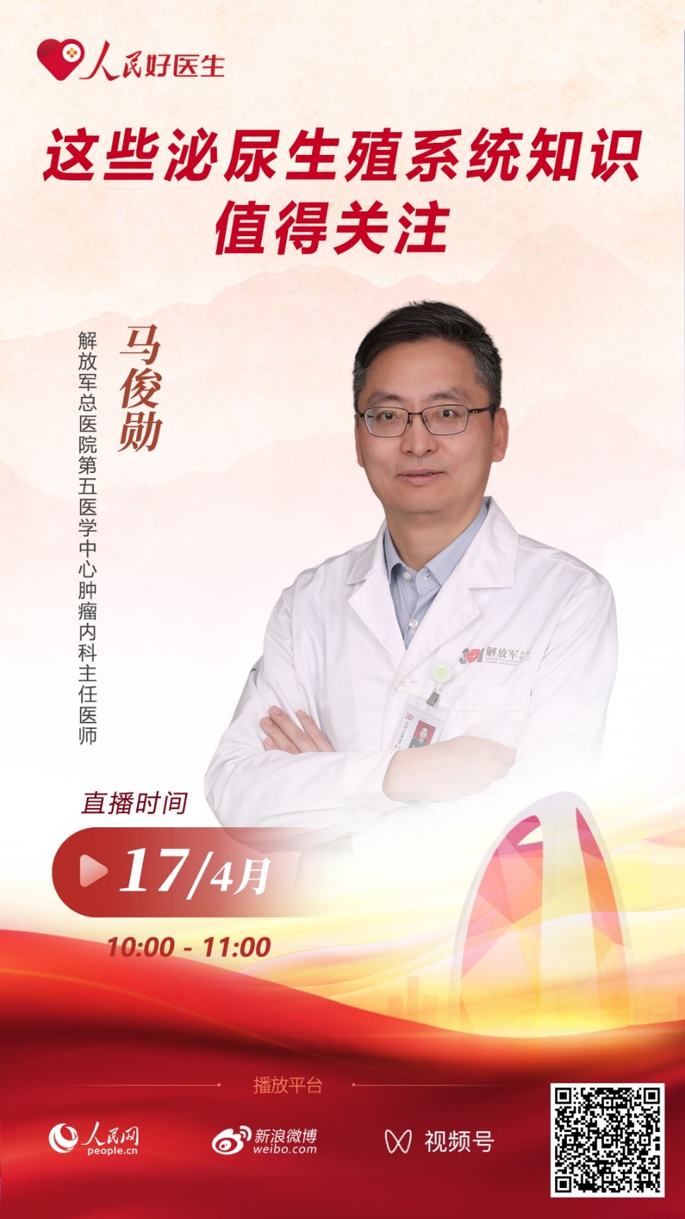4月17日10:00,解放軍總醫(yī)院第五醫(yī)學(xué)中心腫瘤內(nèi)科主任醫(yī)師馬俊勛,將做客“人民好醫(yī)生”演播室,為大家解答有關(guān)泌尿生殖系統(tǒng)腫瘤防治的問題。