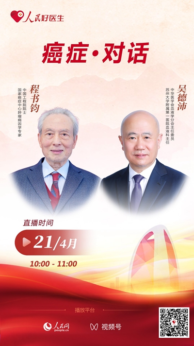 4月21日10:00至11:00,中國工程院院士、遺傳毒理學(xué)專家、中國醫(yī)學(xué)科學(xué)院腫瘤醫(yī)院研究員程書鈞,蘇州大學(xué)附屬第一醫(yī)院血液科主任、第十三、十四屆全國政協(xié)委員吳德沛做客“人民好醫(yī)生”客戶端直播間,圍繞公眾關(guān)心的癌癥成因、癌癥預(yù)防與治療等話題展開深入探討,分享各自的臨床經(jīng)驗與研究成果。歡迎屆時收看。