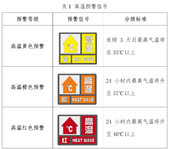 (1)高溫預(yù)警信號(hào)。《氣象災(zāi)害預(yù)警信號(hào)及防御指南》規(guī)定高溫預(yù)警信號(hào)分三級(jí)(詳見(jiàn)表1)。