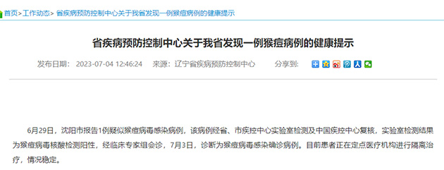 人民網(wǎng)北京7月4日電 (記者孫紅麗)據(jù)遼寧省疾病預(yù)防控制中心官網(wǎng)消息,6月29日,沈陽市報(bào)告1例疑似猴痘病毒感染病例,該病例經(jīng)省、市疾控中心實(shí)驗(yàn)室檢測及中國疾控中心復(fù)核,實(shí)驗(yàn)室檢測結(jié)果為猴痘病毒核酸檢測陽性,經(jīng)臨床專家組會(huì)診,7月3日,診斷為猴痘病毒感染確診病例。目前患者正在定點(diǎn)醫(yī)療機(jī)構(gòu)進(jìn)行隔離治療,情況穩(wěn)定。