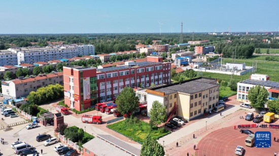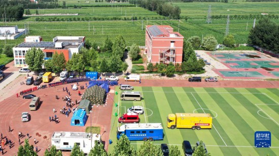 8月6日,在平原縣王打卦中心小學(xué),應(yīng)急救援隊伍集結(jié)待命(無人機照片)。新華社記者 郭緒雷 攝