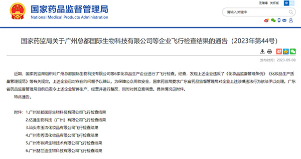 人民網(wǎng)北京9月12日電 (記者孫紅麗)國家藥監(jiān)局近日發(fā)布《關(guān)于廣州總都國際生物科技有限公司等企業(yè)飛行檢查結(jié)果的通告》(以下簡稱《通告》)稱,近期,國家藥監(jiān)局組織對廣州總都國際生物科技有限公司、億通生物科技(廣州)有限公司、汕頭市玉潔化妝品有限公司、廣州市秀語化妝品有限公司、廣州市妝妍生物技術(shù)有限公司、廣州赫蘭迪生物科技有限公司等6家化妝品生產(chǎn)企業(yè)進(jìn)行了飛行檢查。經(jīng)查,發(fā)現(xiàn)上述企業(yè)違反了《化妝品監(jiān)督管理?xiàng)l例》《化妝品生產(chǎn)質(zhì)量管理規(guī)范》等有關(guān)規(guī)定。上述企業(yè)已對存在的問題予以確認(rèn)。