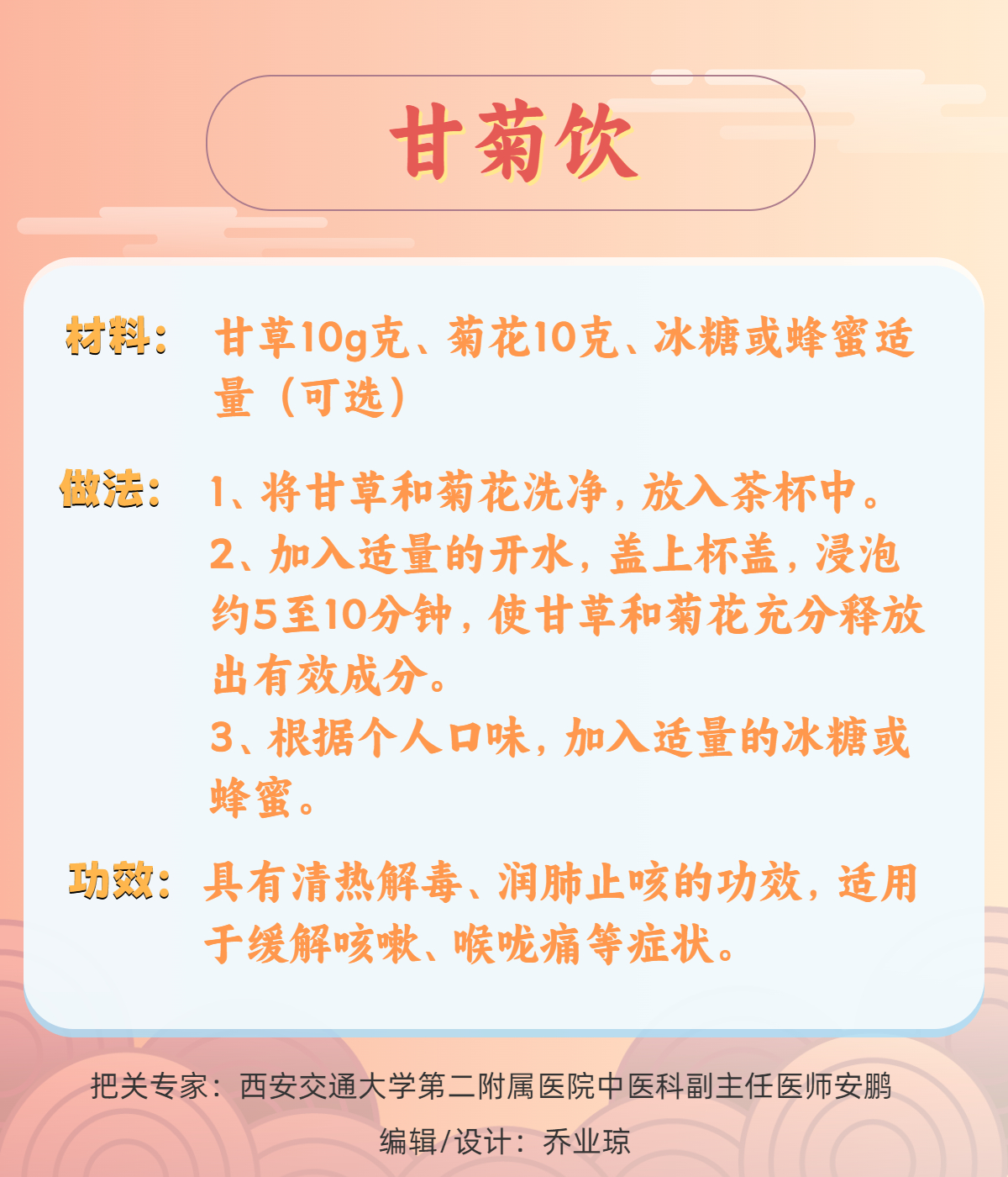 人民網(wǎng)北京2月4日電 (記者喬業(yè)瓊)最近不少網(wǎng)友反映,感染呼吸道疾病恢復(fù)之后仍然咳嗽不止,尤其是接觸了冷空氣、刺激性氣味、煙霧等,更容易引起咳嗽,影響日常生活。對此,西安交通大學(xué)第二附屬醫(yī)院中醫(yī)科副主任醫(yī)師安鵬根據(jù)不同情況,對應(yīng)推薦6款中藥茶飲,以緩解咳嗽的癥狀。