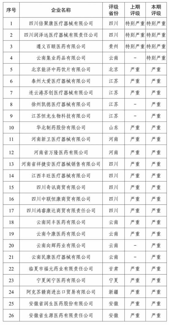 4家評(píng)級(jí)為“特別嚴(yán)重”的醫(yī)藥企業(yè)分別為四川倍聚康醫(yī)療器械有限公司、四川潤澤遠(yuǎn)醫(yī)療器械有限責(zé)任公司、遵義百頤醫(yī)藥有限公司、云南集業(yè)藥品有限公司。22家評(píng)級(jí)為“嚴(yán)重”的醫(yī)藥企業(yè)包括北京能濟(jì)中藥飲品有限公司、泰州大愛醫(yī)療器械有限公司、連云港蘇創(chuàng)醫(yī)療器械有限公司等。