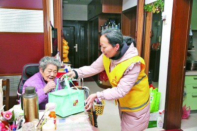 江蘇省常州市鐘樓區(qū)荷花池街道西新橋一村社區(qū)的網(wǎng)格員上門為獨居老人送晚餐。新華社發(fā)