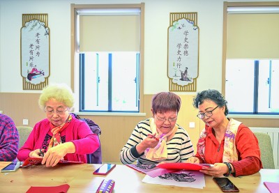 老年人在天津市河西區(qū)越秀路街道居家養(yǎng)老服務(wù)中心進行剪紙手工創(chuàng)作。新華社發(fā)