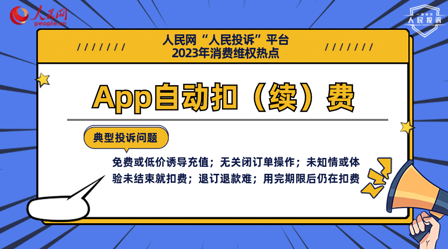 2023年以來,“人民投訴”上,被投訴的App類別涉及工具類、休閑娛樂類、閱讀學習類、通信平臺類、生活服務類、游戲類、出行服務類等多個領域!拔词盏教崾荆恢苯涌鄢荒瓿墪䥺T費”“購買了一年圖片使用權,無按鈕或通道取消自動扣費服務”“點擊免費試用卻被惡意扣費,平臺不退費”“7天體驗期未到,提前12小時自動扣費”“購買1年會員并充值成功,商家以充值成功為由擅自開通自動扣費季度會員”“以1元試用默認開通自動續(xù)費服務,扣費達20月”“購買包月會員時,沒有別的選項可以選擇,都帶著自動續(xù)費”“免費七天VIP,在第六天就被取消了”“已經卸載幾個月了,還在扣錢”等侵權行為令網(wǎng)友困擾不已。