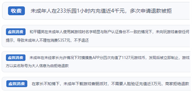 典型投訴問題:身份認證成擺設;大額高頻充值無提醒;平臺和游戲方惡意設置退款障礙、退費額度不合理;防沉迷系統(tǒng)“失防”