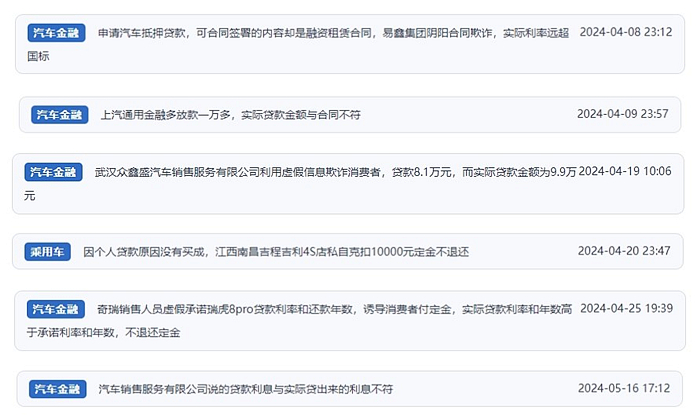 網(wǎng)友涉及汽車金融消費(fèi)相關(guān)投訴問題。(“人民投訴”近期用戶投訴截圖)