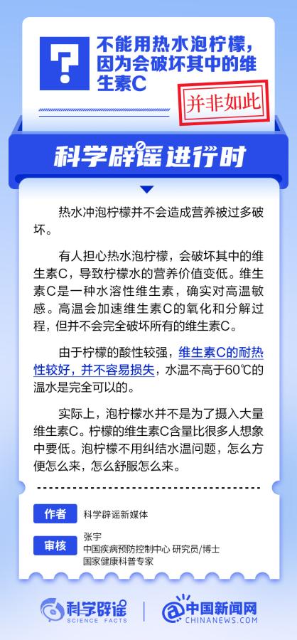 熱水沖泡檸檬并不會(huì)造成營(yíng)養(yǎng)被過多破壞。維生素C是一種水溶性維生素,確實(shí)對(duì)高溫敏感。高溫會(huì)加速維生素C的氧化和分解過程,但并不會(huì)完全破壞所有的維生素C。(來源:@科學(xué)辟謠 中國(guó)新聞網(wǎng)微博)
