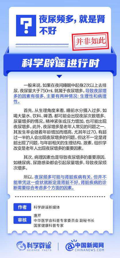 導(dǎo)致夜尿增多的因素有很多,從生理角度來看,睡前水分?jǐn)z入過多,精神緊張或壓力增加,都可能出現(xiàn)夜尿增多。此外,夜尿增多是老年人常見的問題之一,其發(fā)生率會隨著年齡增加而增高。夜尿頻多可能與腎臟疾病有關(guān),但并不能單憑這一癥狀就斷定是腎臟不好,腎臟疾病的診斷需要綜合考慮多個方面的因素。(來源:@科學(xué)辟謠 中國新聞網(wǎng)微博 )